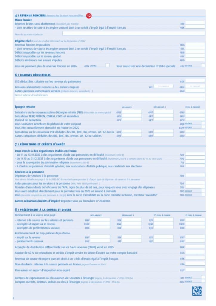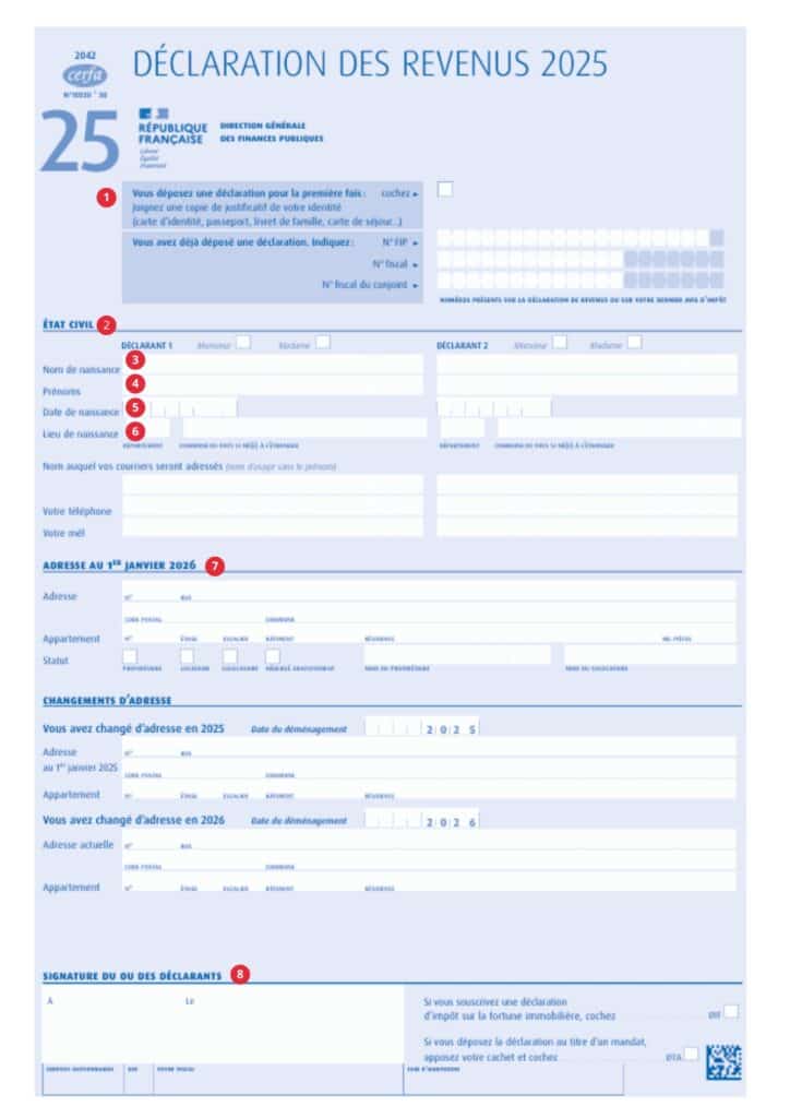 Persoanele care nu sunt rezidente în Franța, dar care au venituri dintr-o sursă franceză, trebuie să declare aceste venituri utilizând Cerfa nr. 2042. Declarația fiscală trebuie depusă în fiecare an între jumătatea lunii aprilie și sfârșitul lunii mai sau începutul lunii iunie, în funcție de departamentul de reședință. Toți rezidenții străini trebuie să trimită acest document, completat corespunzător, autorităților fiscale franceze și să descarce CERFA nr. 2041-E, care trebuie, de asemenea, completat corespunzător. Pentru a completa primul document furnizat de autoritățile fiscale franceze, urmați acești pași: