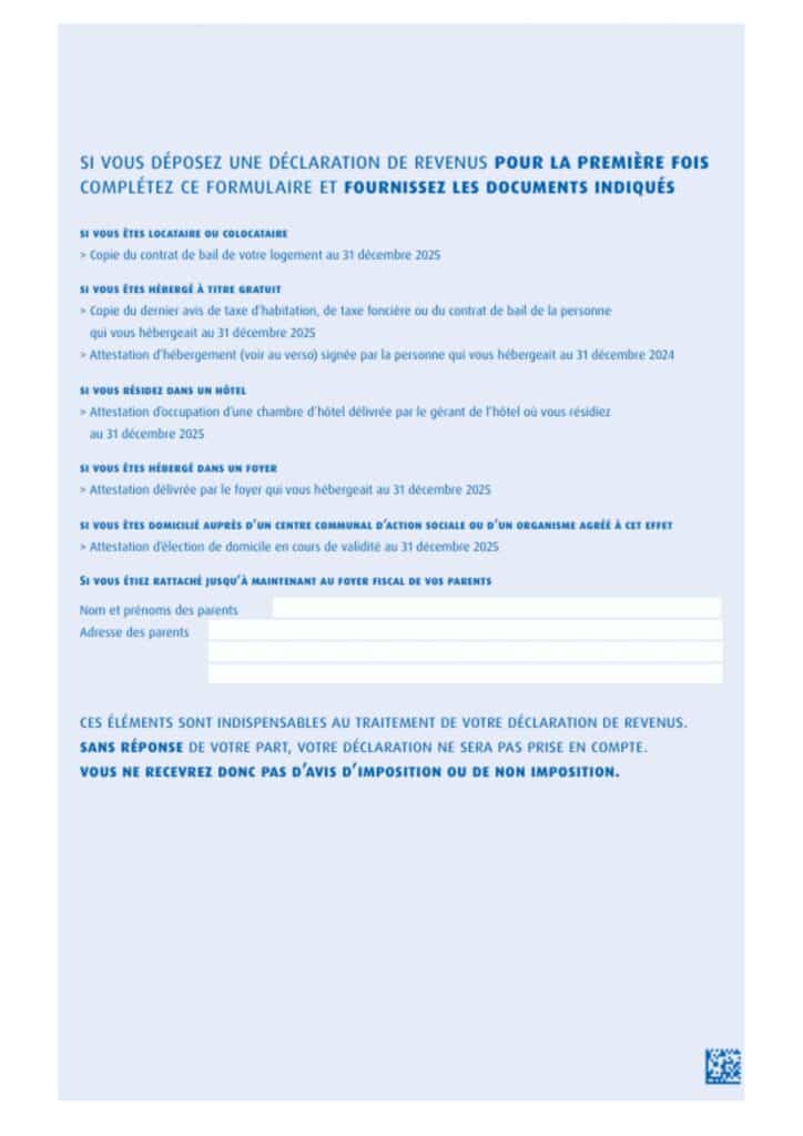 DACĂ DEPUNEȚI PENTRU PRIMA DATĂ O DECLARAȚIE DE IMPOZIT PE VENIT, COMPLETAȚI PREZENTUL FORMULAR ȘI PREZENTAȚI DOCUMENTELE INDICATE – Aici nu trebuie să furnizați nimic, cu excepția cazului în care sunteți rezident fiscal francez.
