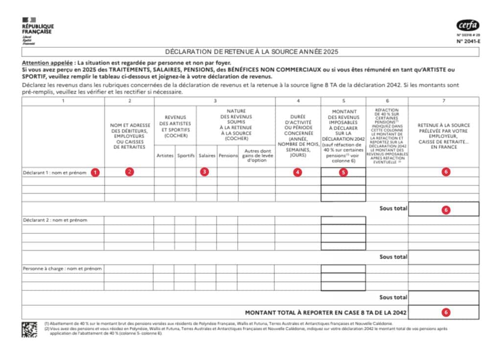 - Suma dedusă la sursă – Această cifră se înscrie la rubrica 6 din documentul CERFA 2041-E precedent – De asemenea, această cifră se înscrie la rubrica 8TA din declarația CERFA 2042